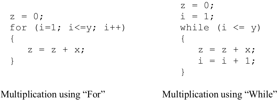 presents an assembly language program that includes a “while” loop. The purpose of the program is to implement the high-level multiplication statement: