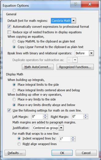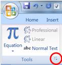 If you find that the equation editor does not format some aspects of equations according to your taste, you may be able to change those aspects with the Equation Options menu. To find this menu, enter the equation editor (<alt>=), and when the “Design” ribbon appears, click on the arrow (circled in red in Figure 2) at the lower-right corner of the “Tools” group. This menu allows you to change, for example, the default font for equations, the placement of integral limits, and margins. It also is the gateway to the Math Autocorrect window discussed in the next section.