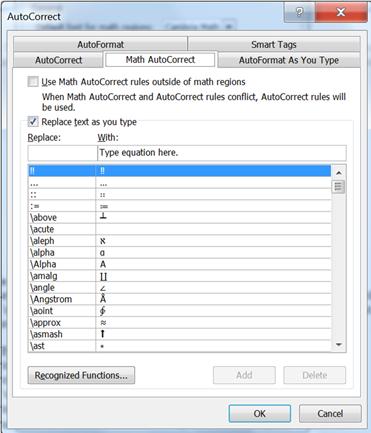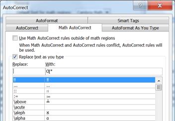 The ASCII hexadecimal code may be useful for a small subset of people. If you type that code into an equation, then select the code and type <alt>x (think of the “x” as standing for hexadecimal), it will convert the number to the corresponding character. You can convert only one character at a time. If you need to use an undefined symbol frequently, you should create your own definition with the Math Autocorrect function described in the section Math Autocorrect: A Useful Look-up Tool.