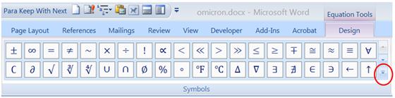 Figure 5: The Symbols group under the Design tab of “Equation Tools.”